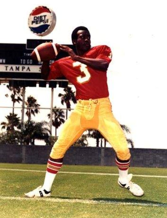 Solomon is fondly remembered by 49ers fans as a speedy, elusive receiver and two-time Super Bowl champion. But before he emerged as a borderline Pro Bowl-caliber wideout, Solomon was a dynamic college quarterback at the University of Tampa in the mid-1970s, where he rushed for 39 career touchdowns and threw for 11. He won Offensive Player of the Game in the 1974 East-West Shrine Game, before which he told a certain Hall of Football writer of his ambition to be the “Black Joe Namath.”